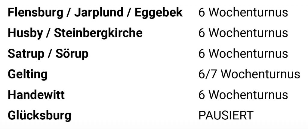 Unsere Touren finden in regelmäßigen Abständen (ca alle 6-7 Wochen) Montags und Freitags und ggf am Wochenende rund 50 km um die deutsch-dänische Grenze statt.