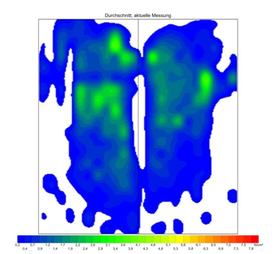 Zudem ist er sehr stabil (lässt sich im Gegensatz zu anderen Baumlosen Modellen NICHT knicken) somit verteilt er das Reitergewicht auf die große Sattelfläche wodurch auch keine Druckspitzen entstehen (siehe Druckmessungsergebnisse: oben: Büffel Short, 2 Jahre alt, täglich in einer Reitschule genutzt, unten: neuer Round Rindsleder).